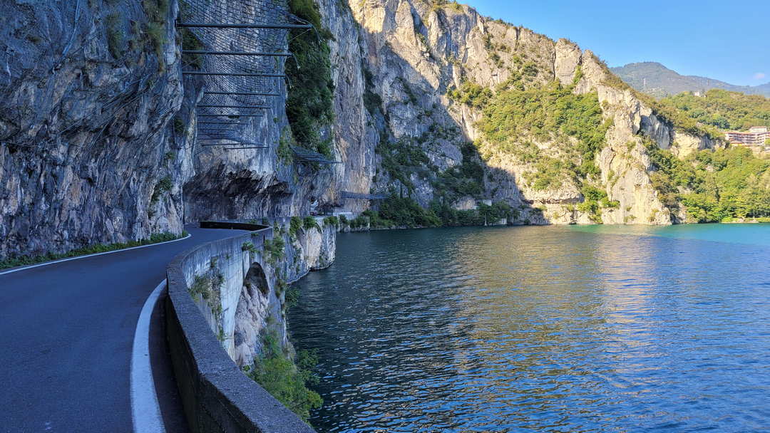 Besonders beeindruckend ist der Abschnitt südlich von Toline: Dort schlängelt sich der Radweg spektakulär zwischen steiler Felswand und Seeufer entlang – ein echtes Highlight. Ebenso schön ist der Abschnitt zwischen Riva di Solto und Castro, wo der See tiefblau schimmert und die Felsen dramatisch ins Wasser abfallen.