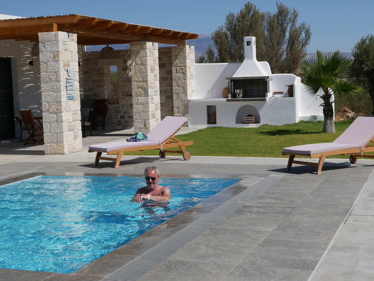 Wir haben unsere beiden Aufenthalte dort sehr genossen, beide Male im September, als die Temperaturen halbwegs angenehm waren. Nach einem tollen griechischen Essen und einem Glas griechischem Wein in einer der Tavernen im Dorf sind wir oft noch in den beleuchteten Pool gesprungen – einfach herrlich!