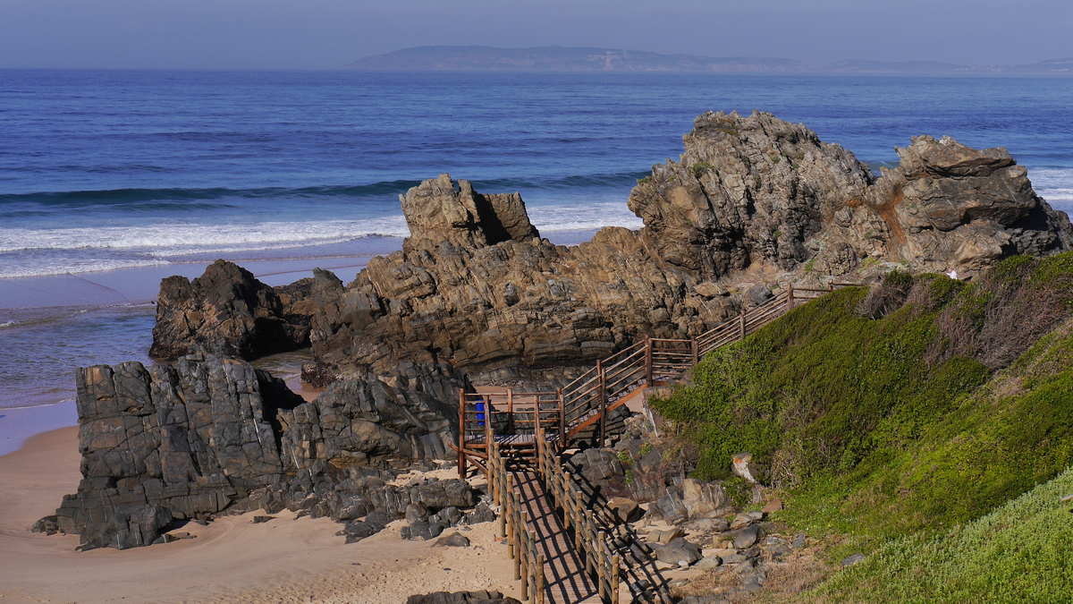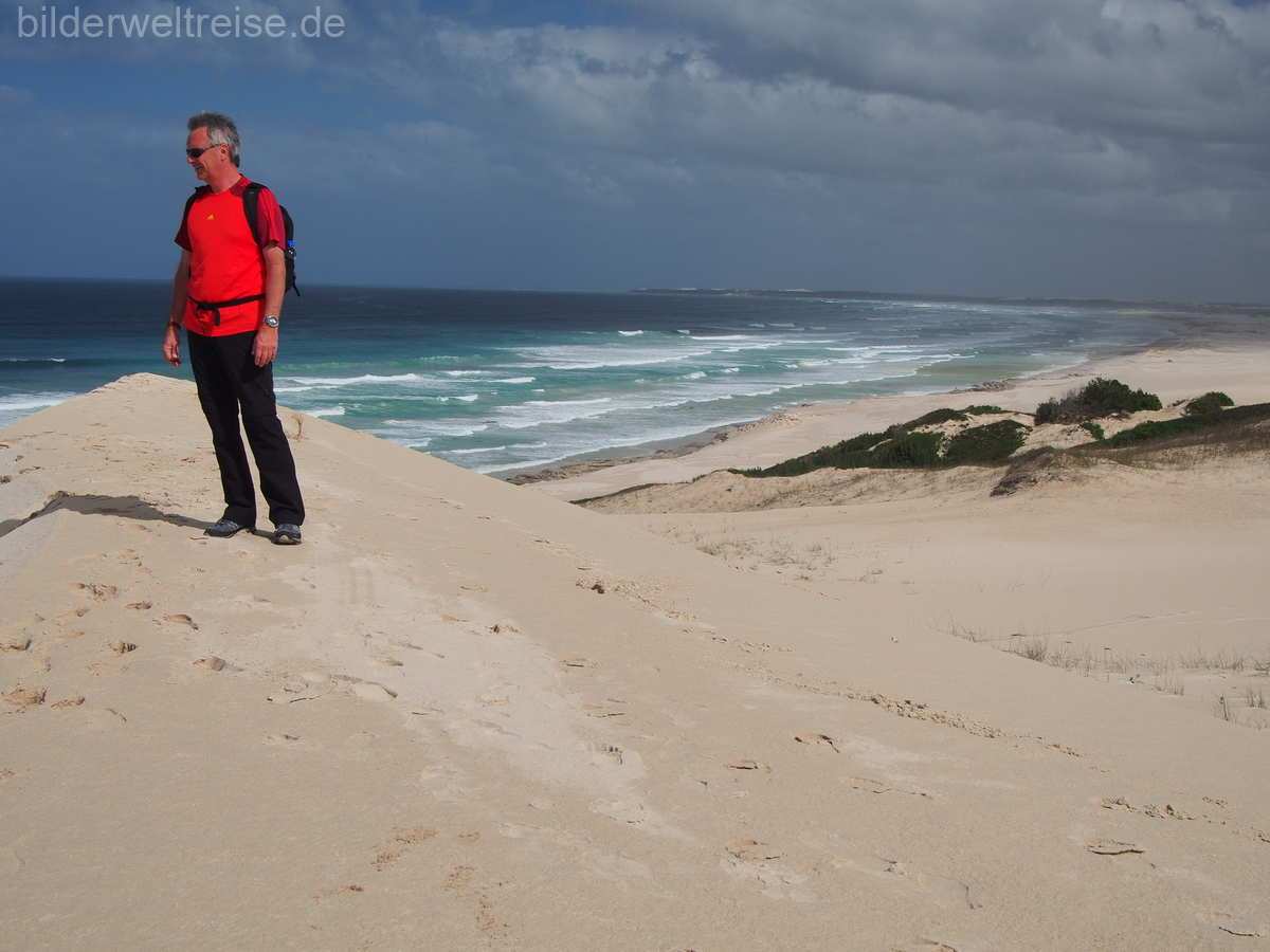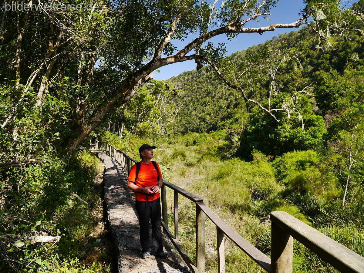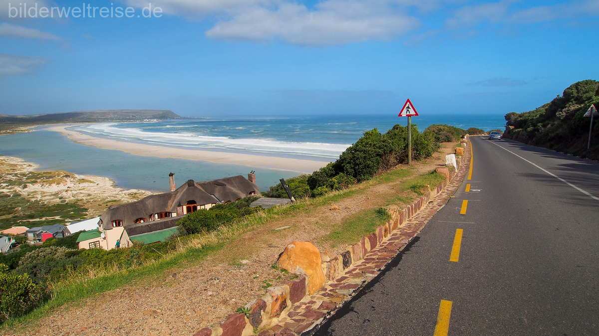 Von Oudtshoorn ging es dann an den indischen Ozean nach Wilderness in das traumhaft gelegene Dune Guest House, wo Strand und herrliche Wanderungen im Nationalpark angesagt waren. Der schnellste Weg führt, mit rund 70 km, über die N12. Wir haben uns für die gut doppelt so lange Variante über die R328, mit Abstecher nach Mossel Bay, und dann weiter über N2 und nochmals einen Umweg über die schöne R102 Richtung Wilderness entschieden. Knapp 2 km vor Wilderness sollte man, von der N2 aus, direkt den Dolphin Point Lookout anfahren, von hier hat man einen herrlichen Blick auf den langen Strand von Wilderness.