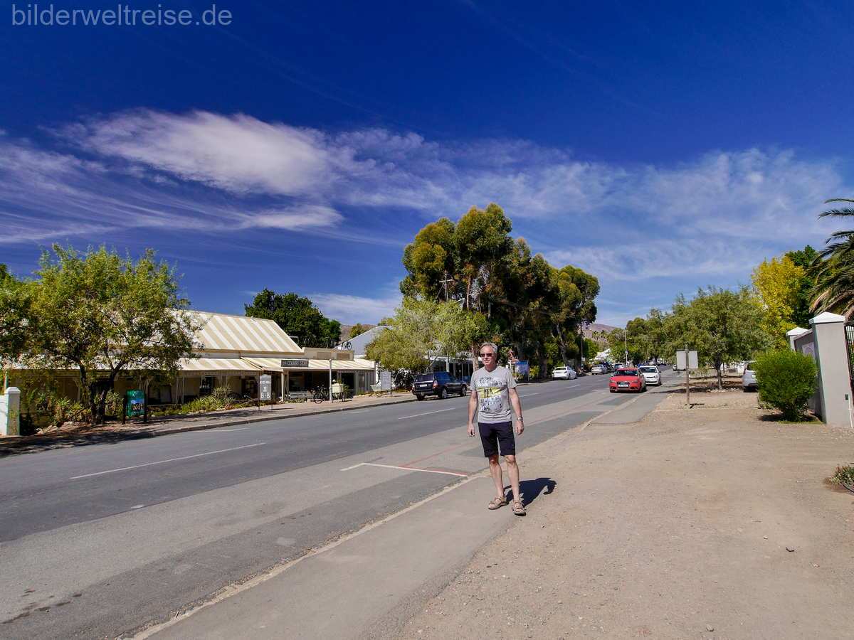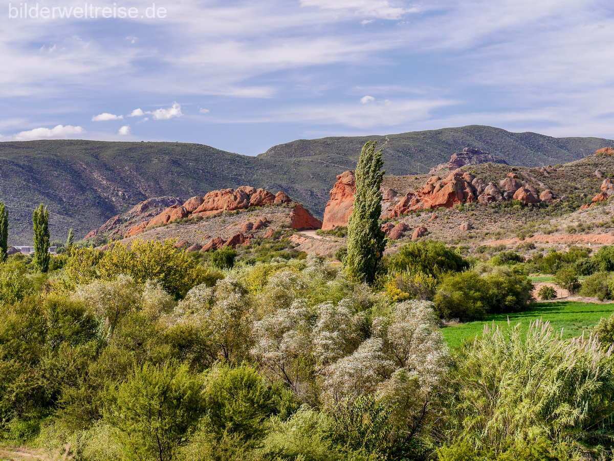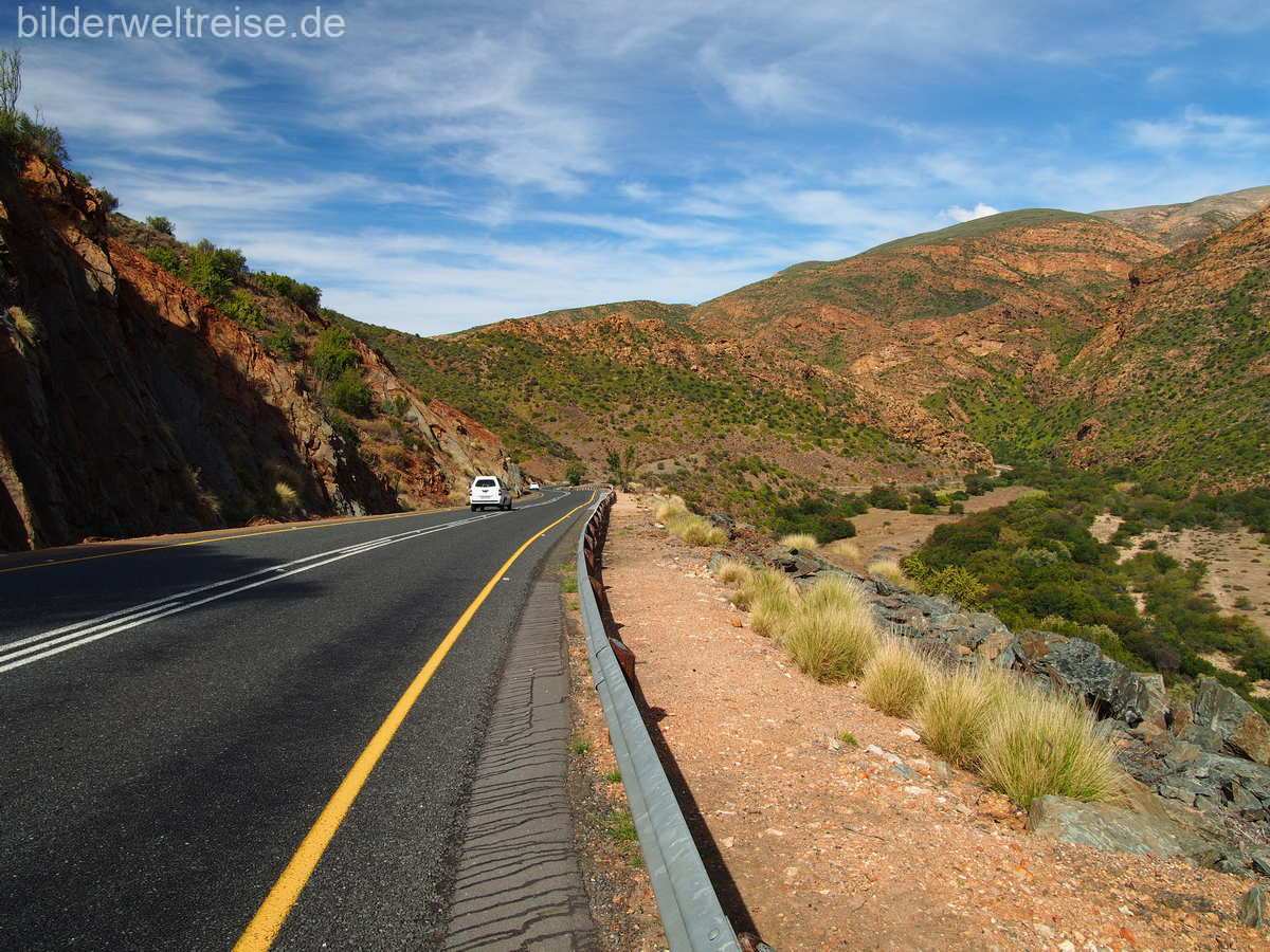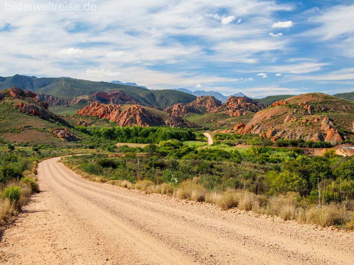 Am nächsten Tag weiter auf der R 62 durch schöne Landschaft und einem obligatorischen Stop im kultigen Ronnies Sex Shop. Weiter auf der R62 lohnt rund 14 km hinter Calitzdorp, Richtung Kruisrivier ein Abstecher von der R62 auf einer Staubpiste in die Red Rocks. Die Landschaft wird schon nach wenigen Fahrminuten mystisch und wunderschön mit den roten Felsen. Man erreicht die herrlich gelegene Red Mountain Ridge Karoo Oasis and Guest Farm, wo man übernachten kann oder man dreht wieder um, um auf der R62 weiter durch die kleine Karoo nach Oudtshoorn zu fahren. Die Straußenhauptstadt Südafrikas und mit 86000 Einwohnern die bedeutendste Stadt der kleinen Karoo.
