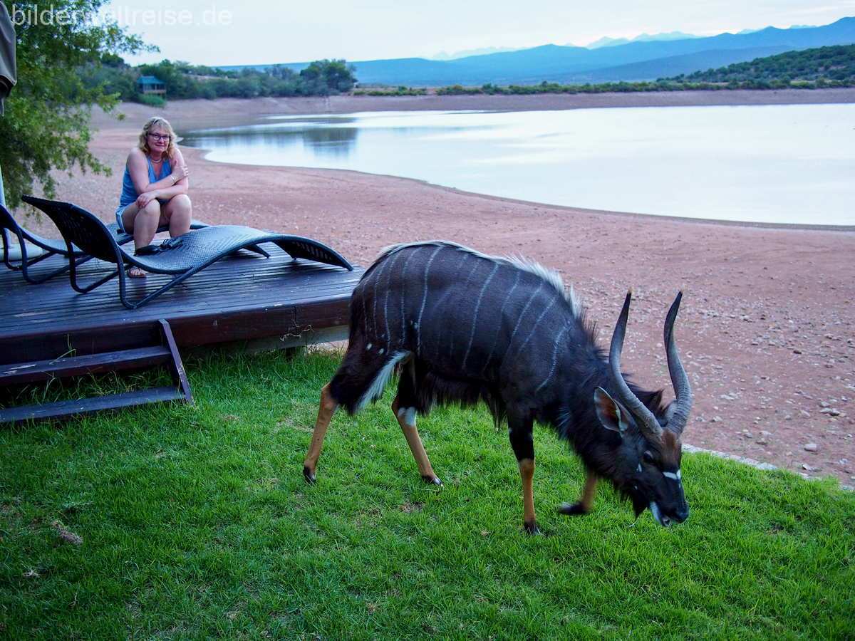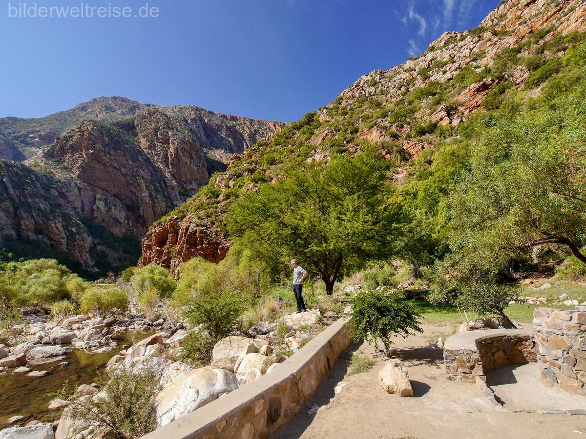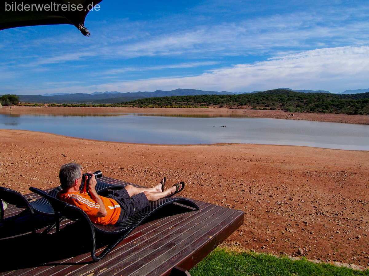 Hier haben wir 3 Nächte in der empfehlenswerten Buffelsdrift Game Farm in einem tollen Zelt, direkt am kleinen See genossen haben. Inkl. Safarifahrten und Halbpension. Unbedingt empfehlenswert ist ein Tagesausflug durch die gewaltige Meiringspoort Schlucht bis Prince Albert und von dort zurück über den berühmten Swartbergpass.