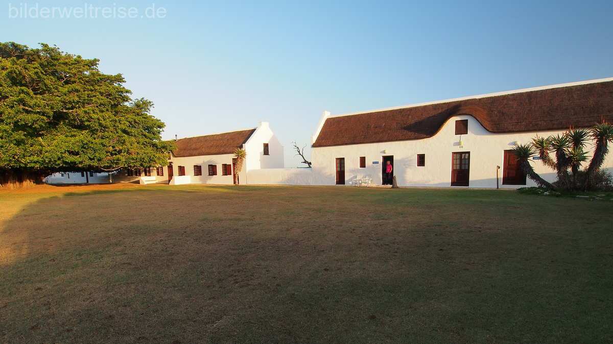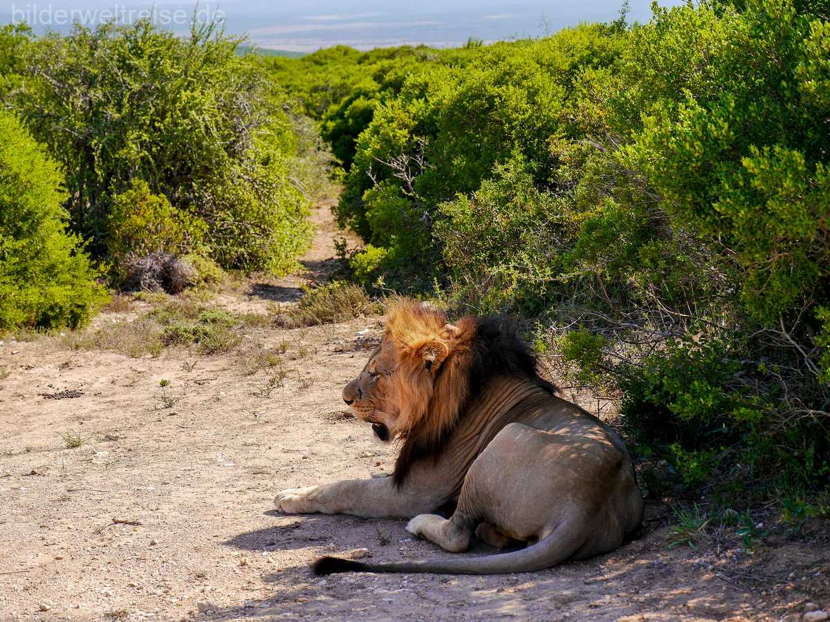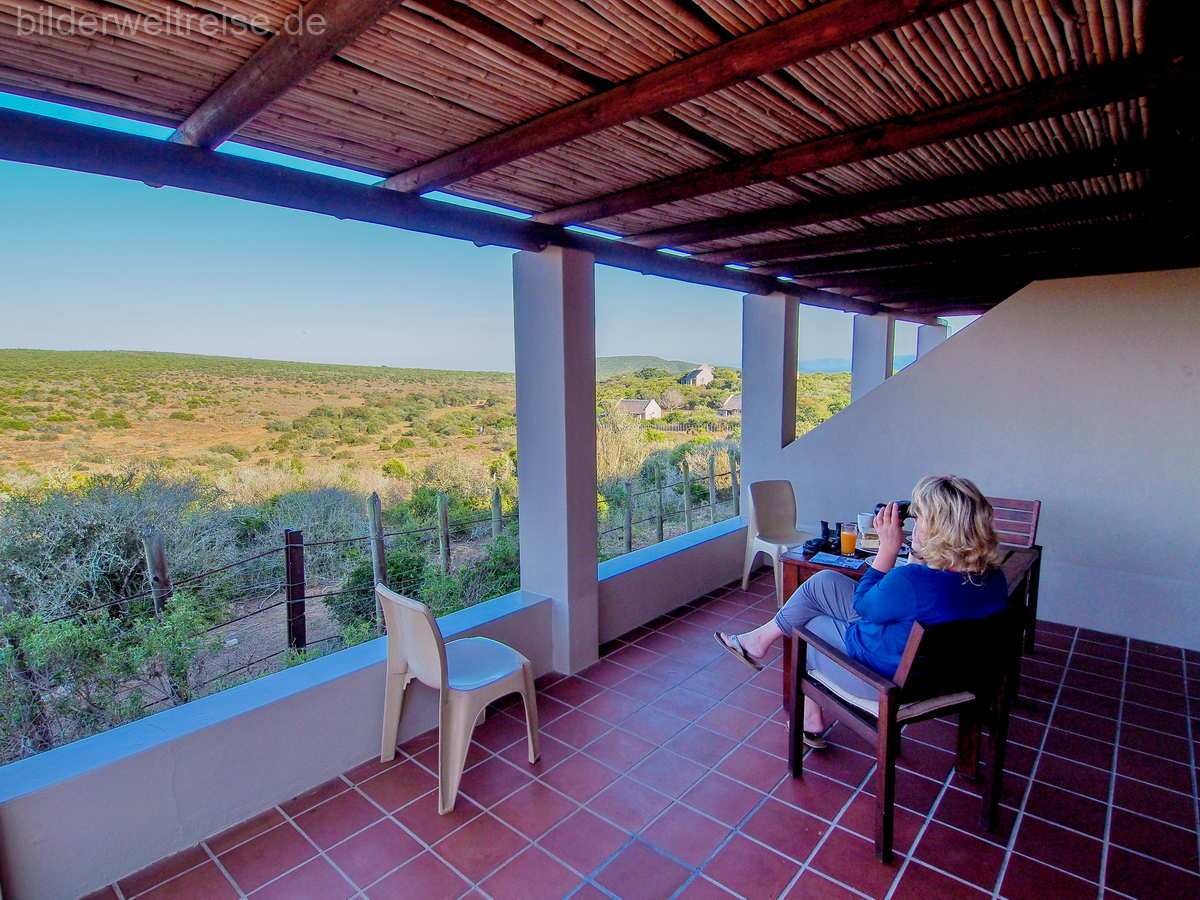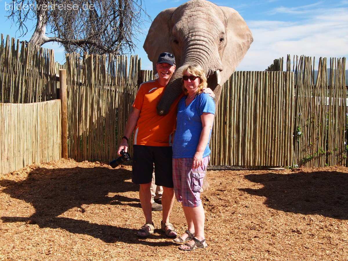 Das nächste Ziel war der 370 km entfernte Addo Elephant NP, wo wir 3 Nächte im Main Camp ein Chalet bezogen haben, direkt am Zaun mit direktem Blick in den Park. Das Main Camp hat ein gutes Restaurant und einen kleinen Shop. Hier sind die Menschen mit einem Zaun umgeben und die Tiere in Freiheit 😉 Das Chalet selbst war recht einfach gehalten und Astrid konnte sich mit dem Geruch drinnen nicht so recht anfreunden. Der NP selbst ist sehr lohnenswert und wir haben auf unseren Pirschfahrten viele Tiere beobachten können. Im Addo sind die ‚Big 5‘ zu Hause. Aber das ist noch nicht alles: der Park ist inzwischen der drittgrößte in Südafrika und neben den großen Landtieren kann man auch Wale und den weißen Hai beobachten. Weltweit ist er der einzige Park mit den Big Seven! Denn eine große Fläche des Parks befindet sich im Meer.